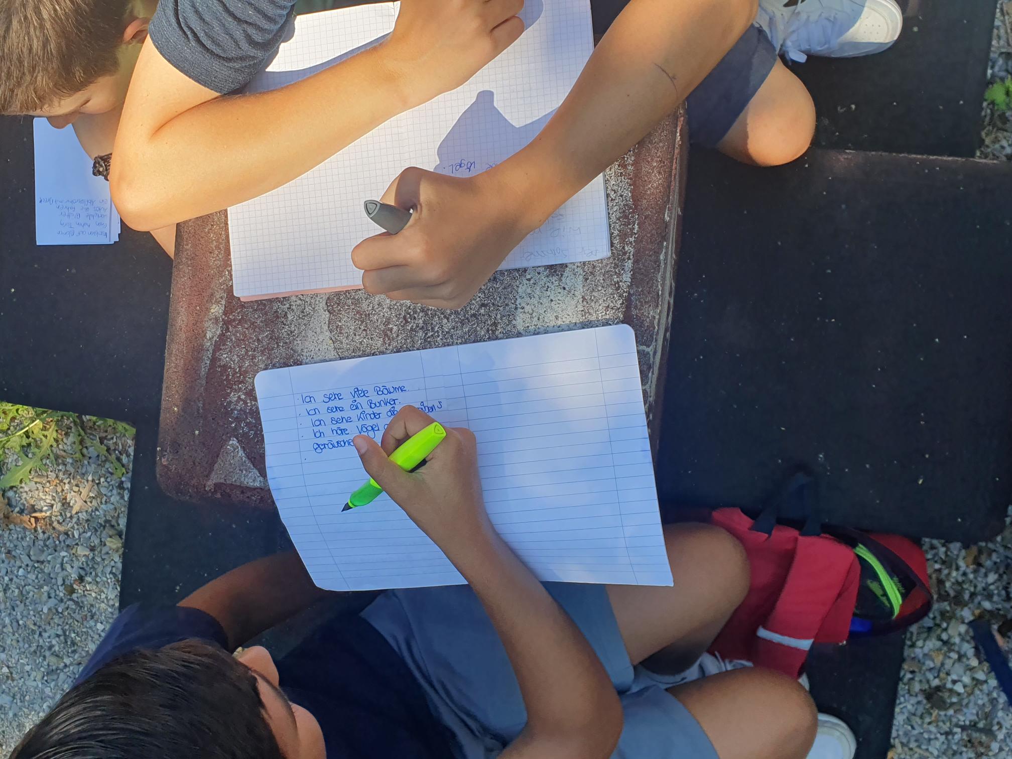 Ein erster Projekttag führte die Klasse an die Gehörlosenrealschule. Dort lernten sich die Schülerinnen und Schüler beider Schulen kennen. Durch vielfältige Übungen zum Wahrnehmen, Erfinden und Formulieren wuchs das Vertrauen – und die anfängliche Scheu vor dem Schreiben wich spürbar der Freude am Ausdruck. Ob allein, zu zweit oder in Kleingruppen, im Klassenzimmer, draußen in der Natur oder zu Hause am eigenen Schreibtisch: Schreiben wurde für die Sechstklässler im zweiten Halbjahr 2024/25 zu einem treuen Begleiter.